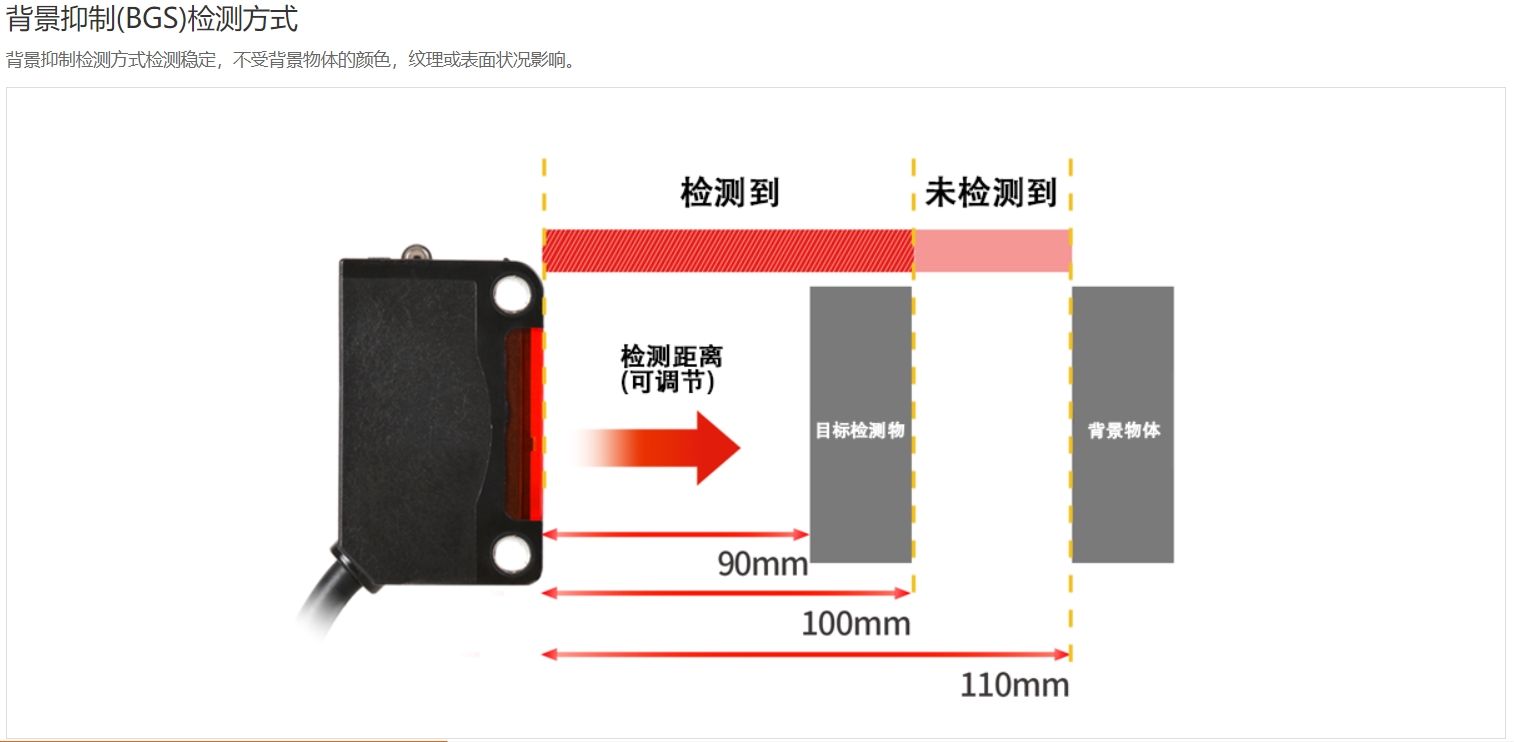 背景抑制(BGS)检测方式检测稳定,不受背景物体的颜色,纹理或表面状况影响。