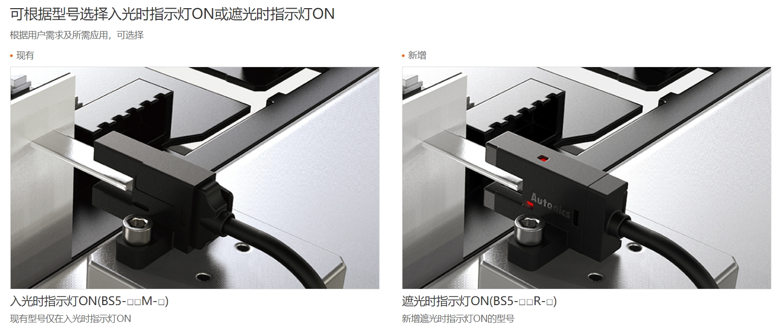 凹槽深度9mm微型光电传感器 BS5系列微型光电传感器有8种不同外形(K,T,V,L,Y,F,R,TA型),为各种用户应用和安装 设置提供最大的灵活性。传感器的设计可最大程度减少异物引起的误动作。 传感器具有较高的可视性,可从多个方向查看动作指示灯。
