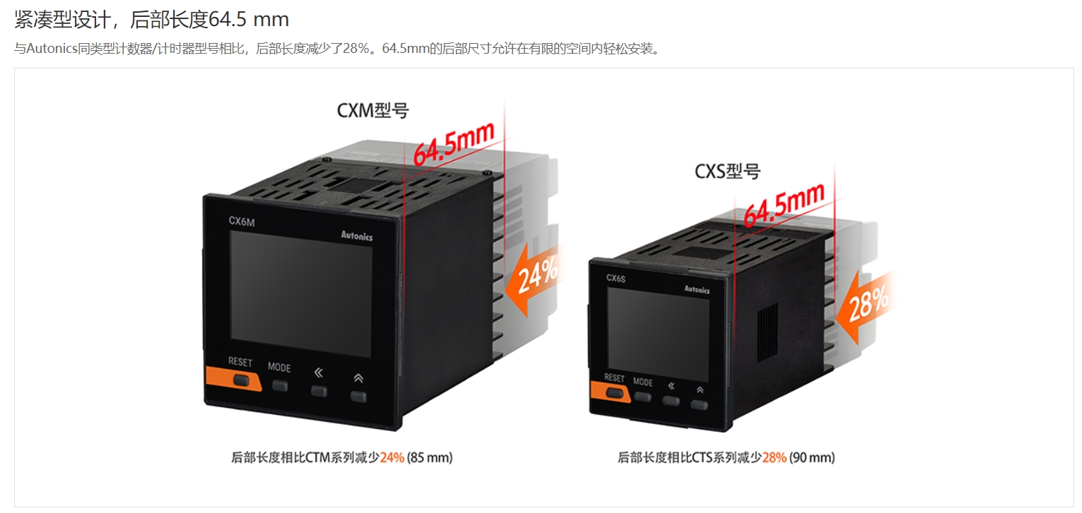 LCD显示型计数器/计时器 CX系列计数器/计时器采用LCD显示屏,带有易于读取的白色PV字符。 11段码字体可以显示各种字母、数字、字符,以便于状态读数。 用户可根据需要在计数器和计时器模式之间切换,以实现灵活应用。 紧凑的64.5mm后部尺寸允许在狭小的空间内灵活安装。 本产品可选择电压输入(PNP)/无电压输入(NPN)类型和通用电压输入类型。