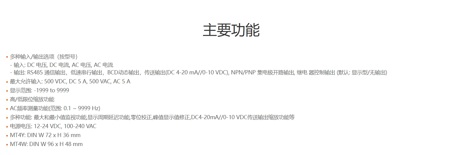 多功能电压电流表 MT4Y系列紧凑型数字电压/电流表具有多种种输入和输出选项,可在各种环境中灵活应用。 可显示-1999〜9999之间的测量值,具有上下限显示刻度,交流频率测量,零点调整,光伏发送输出刻度等多种用户友好功能。 MT4Y系列仪表为DIN W 72 x H 36 mm.